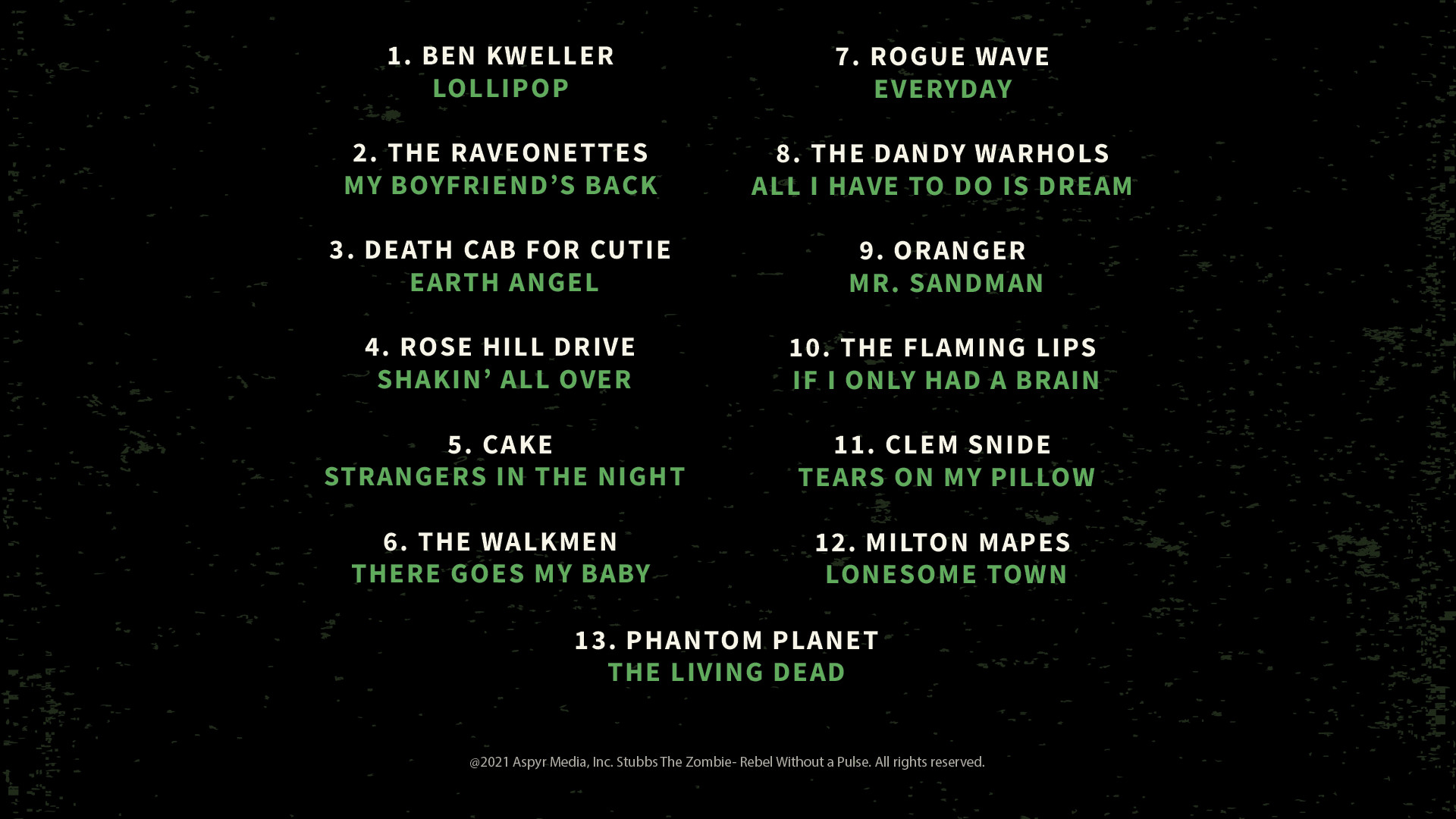 🎵 Oficjalna ścieżka dźwiękowa Stubbs the Zombie – współczesne covery hitów lat 50. w wykonaniu m.in. Cake, The Flaming Lips i Death Cab for Cutie.